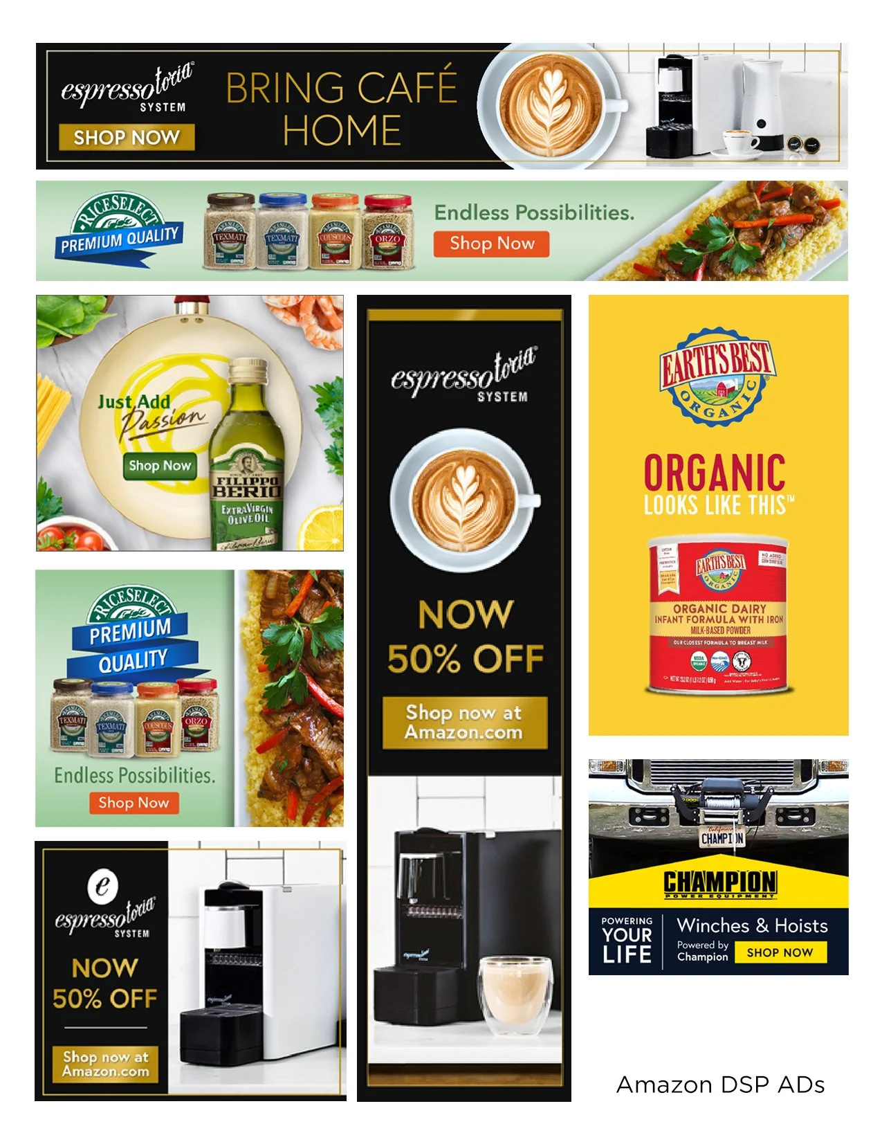 This series showcases Amazon DSP ad designs developed for multiple CPG brands across diverse categories. My goal was to create visually engaging, conversion-driven assets that remained authentic to each brand’s voice—from the sleek sophistication of Espressotoria to the bright, family-friendly tone of Earth’s Best. Each layout was optimized for performance across Amazon’s ad placements while maintaining strong brand consistency.